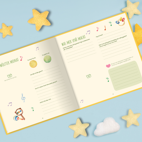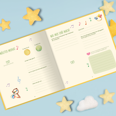 Das Buch „Wie ich aufwachse“ wird zunächst von den Eltern ausgefüllt, später kann es ein Kind mit seinen Bildern, Notizen oder Fotos selbst mitgestalten.